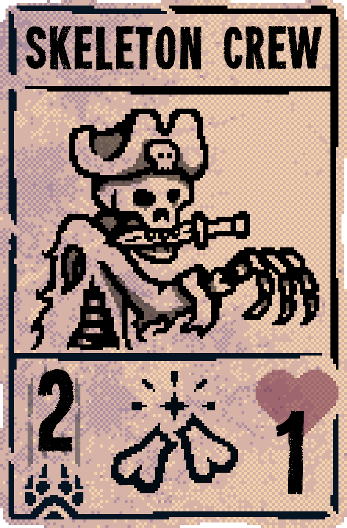 Skeleton Crew is a card seen in Royal Dominguez's boss fight that cannot be obtained, although you can temporarily obtain this card on your side of the board by damaging The Limoncello and having a free space where this card will drop.